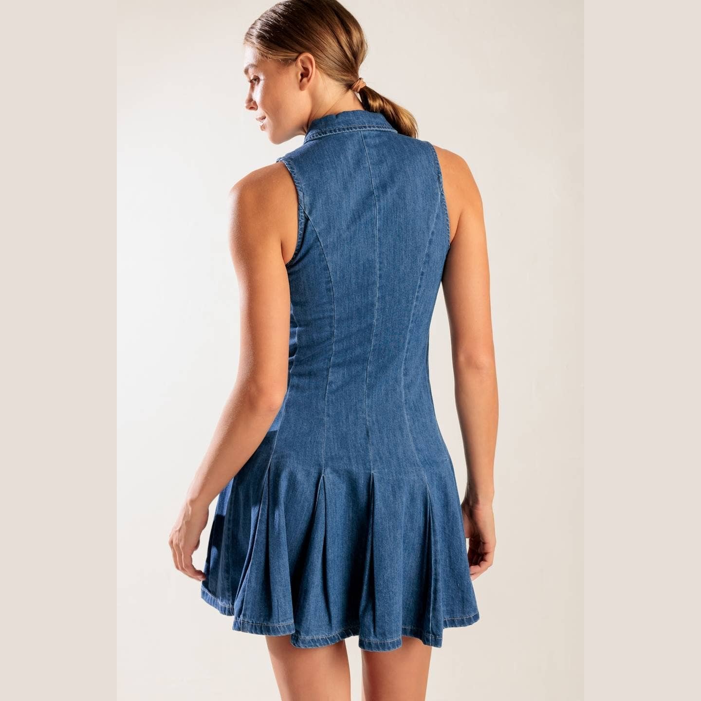 • Sporty meets chic in this versatile washed denim mini dress, featuring a classic collar, button-down front, and a flattering fitted waist. The standout detail? Inverted pleats that add movement and a flirty, feminine edge to its structured silhouette. Whether you dress it up with boots or keep it casual with sneakers, this piece is perfect for layering and wearing year-round. From game days to weekend brunch, this denim mini is a total staple.