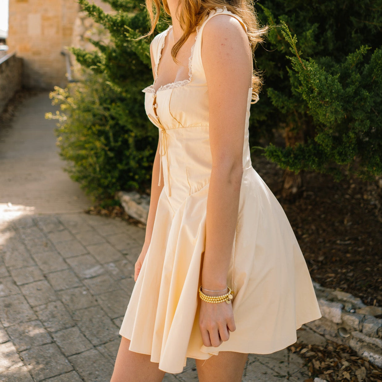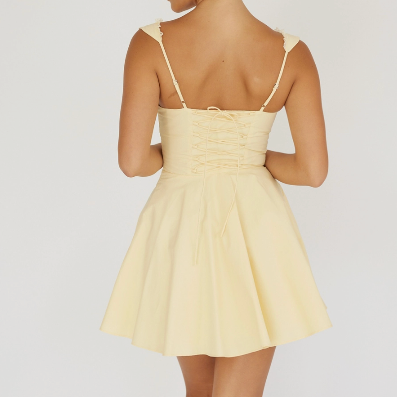 - This dress is a true ray of sunshine! It’s the perfect baby yellow, making it such a flattering color. Plus the silhouette is stunning & hugs all the right places!