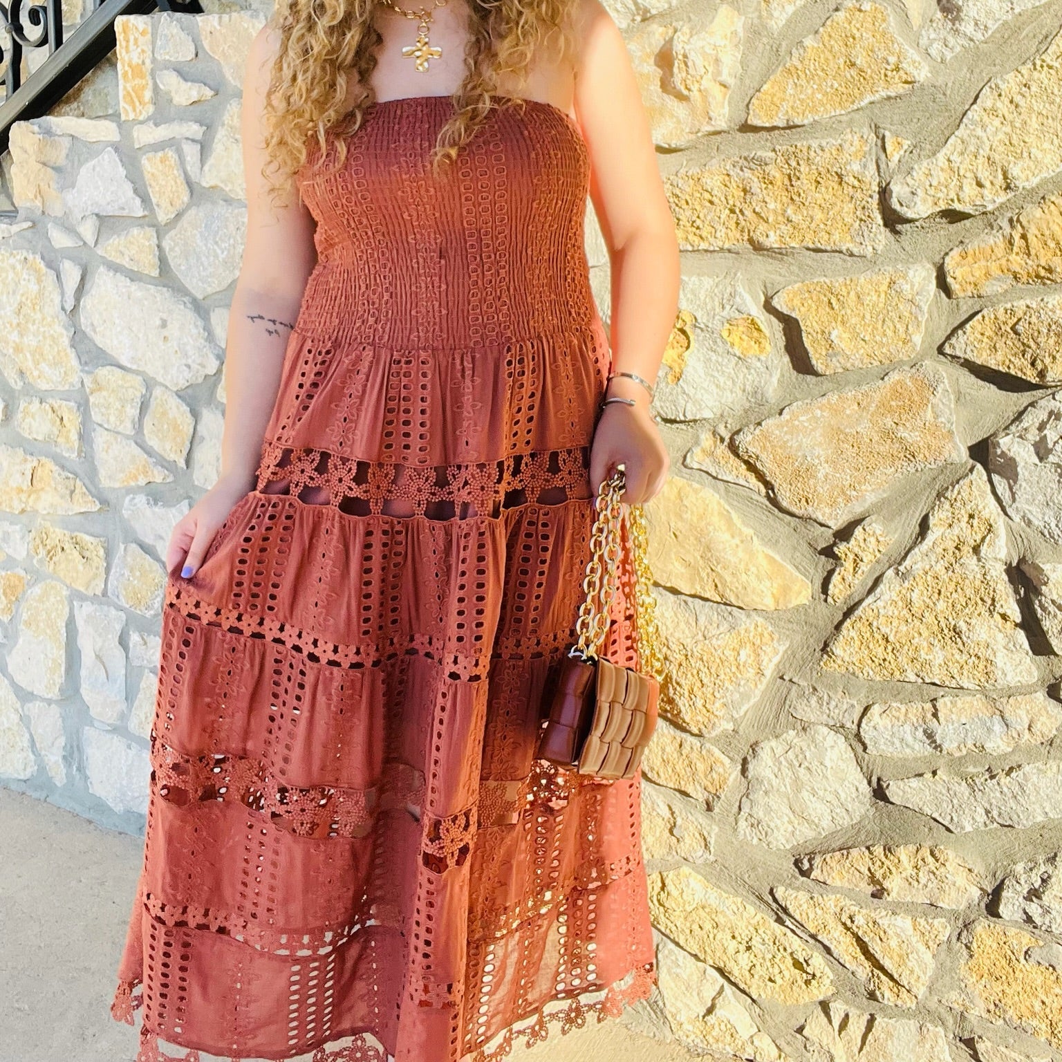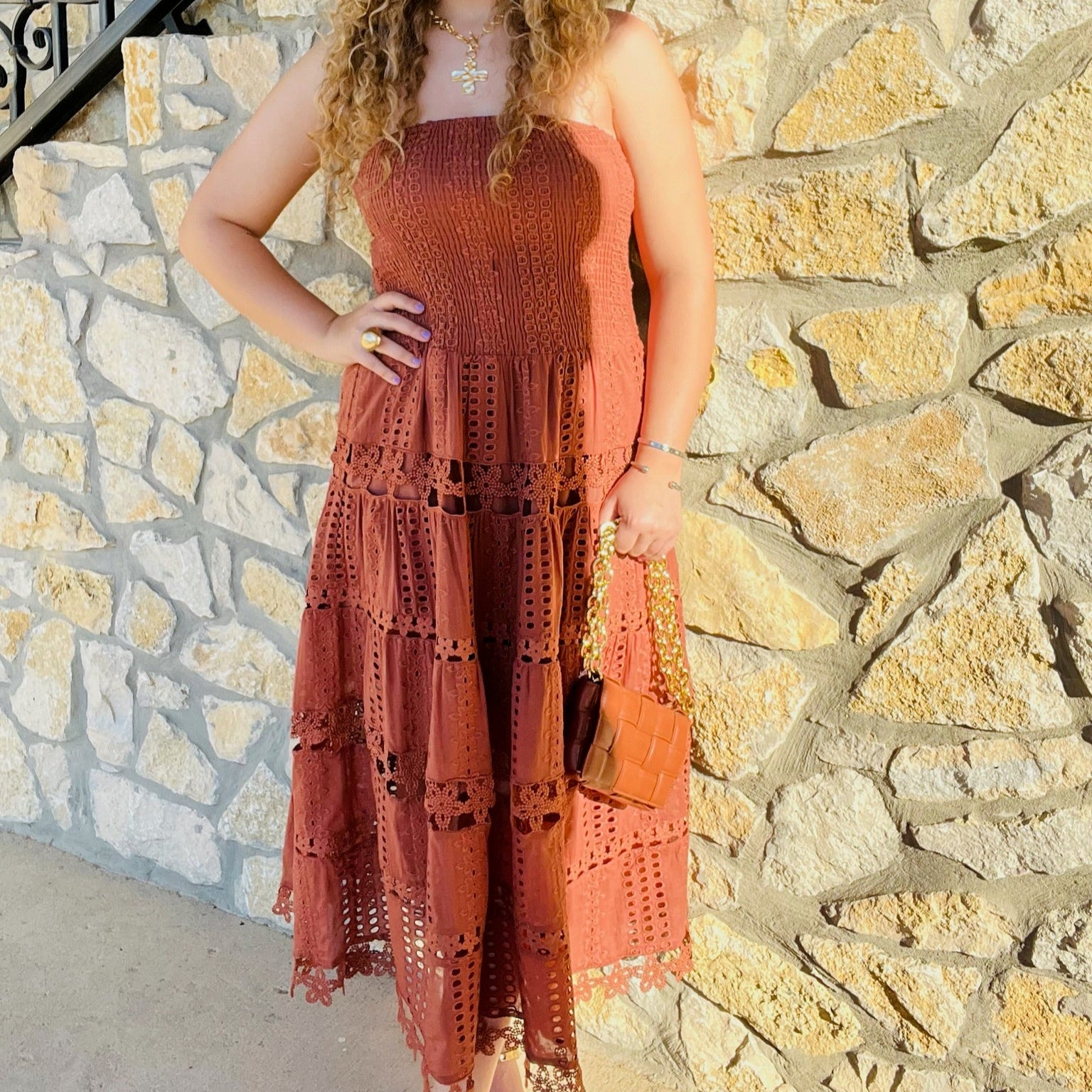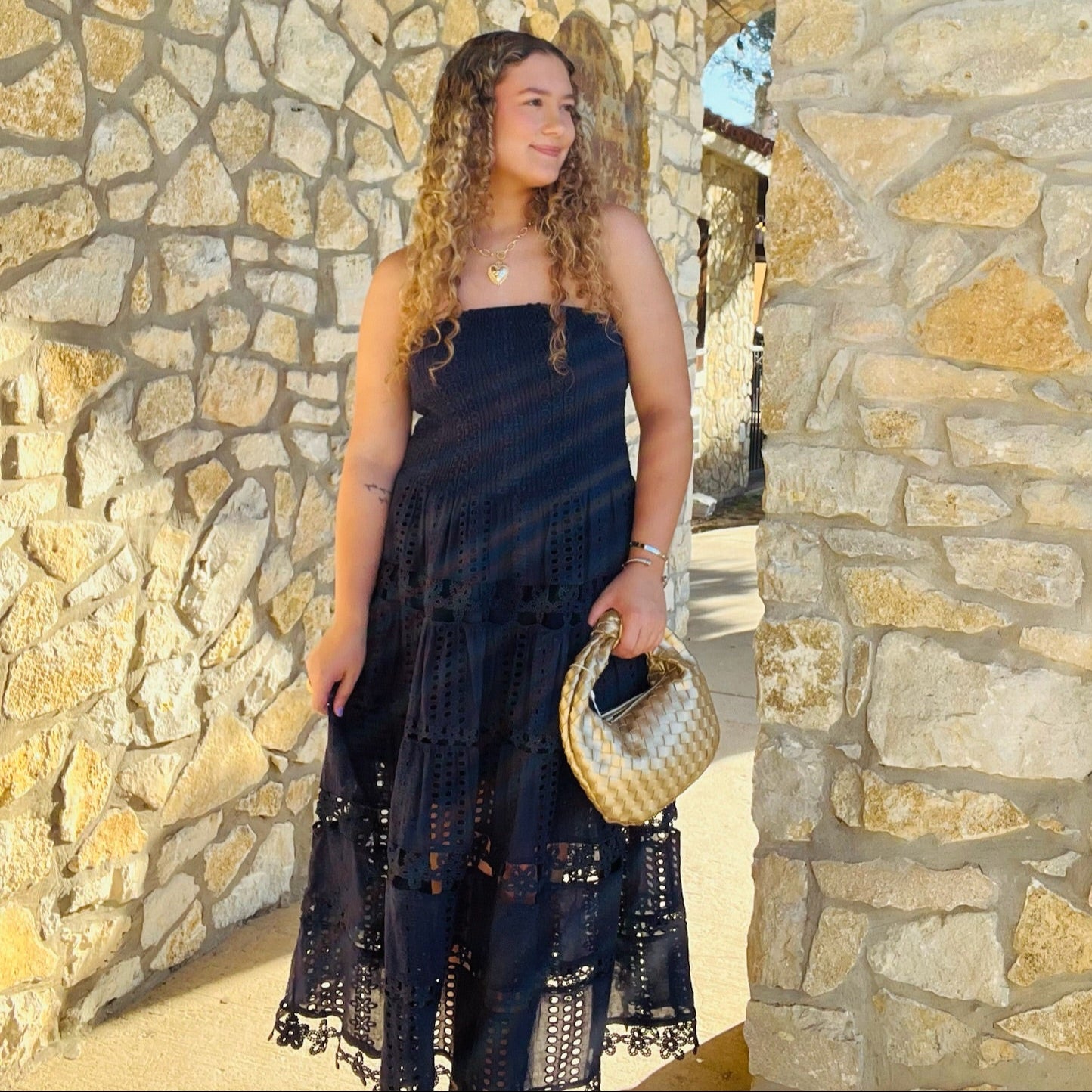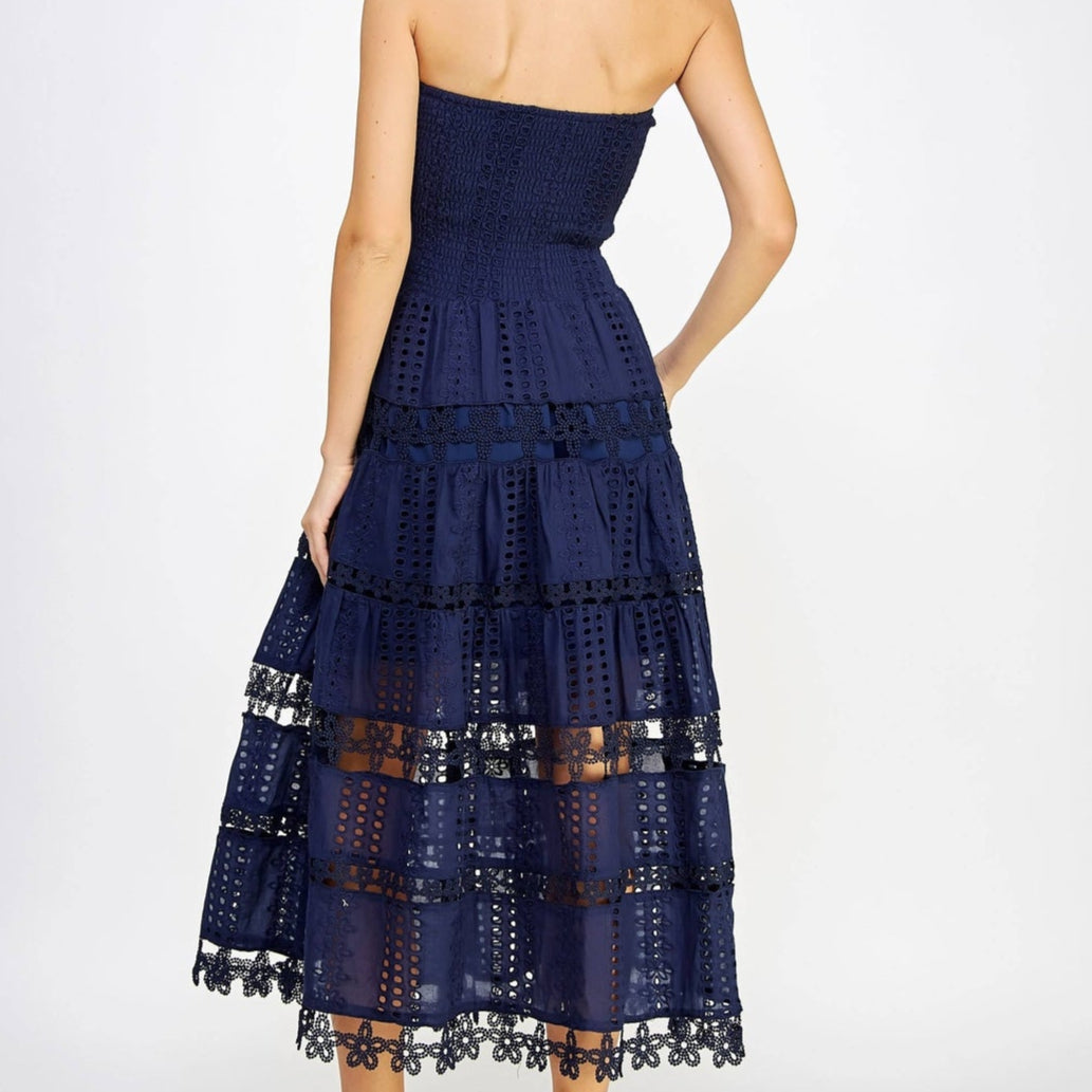 • Romantic, flirty, and effortlessly chic – the eyelet midi dress is your go-to for whimsical charm. With its strapless smocked bodice, delicate crocheted lace, and scalloped hemline, this piece is both feminine and timeless. Lightweight cotton keeps you cool in the lingering summer heat, while the elegant midi length transitions beautifully into fall. Perfect for weddings, brunches, or dreamy date nights, it’s the dress that makes every occasion feel like a fairytale.